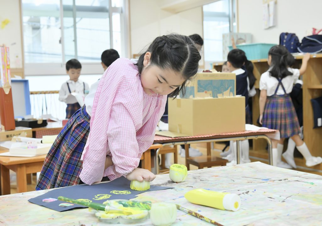 ゆり組はハサミやノリを使い始めたばかりですが、工作が面白く愉しくなってきました。枝組は青梗菜を横に切ってスタンプで鱗を押しました 枝組は代々お兄さんお姉さんが作って持ち帰っていた憧れのこいのぼりを一生懸命作りました。