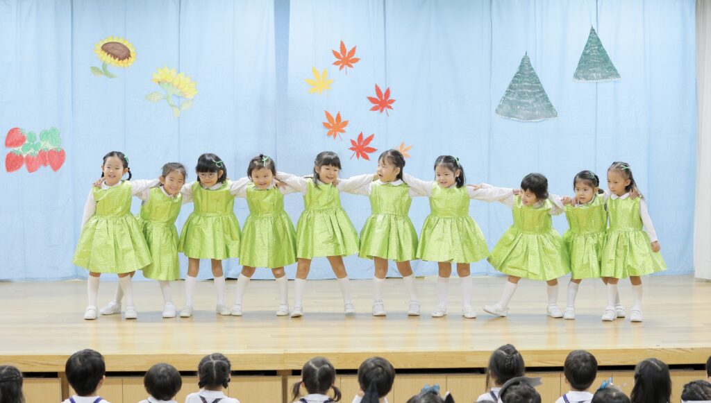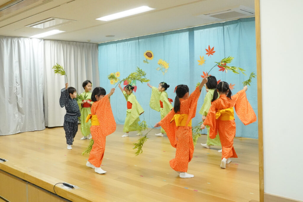 枝組は、みこころ幼稚園に代々伝わる大太鼓「太陽のまつり」を力強く披露し、日本舞踊では、華やかなお着物着て一生懸命練習していました。